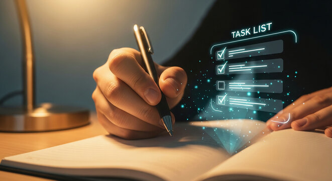 Person writing in a notebook with a digital task list overlay.