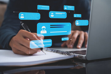 Person working on laptop and writing notes, with digital communication bubbles overlaying the scene, representing modern productivity and information exchange in a hybrid workspace.