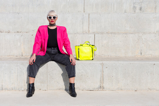 Confident female model wearing bright pink jacket sitting on stairs with vivid yellow handbag in city and looking at camera