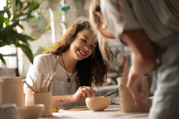 Close-up view of two women working with clay in a pottery class. Craft, art and hobbies concept.