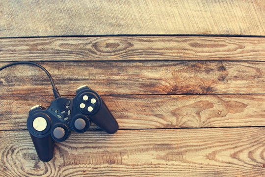 Video game controller on old wooden background. Toned image. Top view.