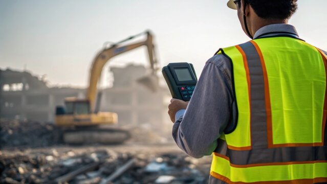 A worker in a reflective vest uses a handheld device to inspect debris in the foreground while a large machinery silhouette looms in the background illustrating the scale of the