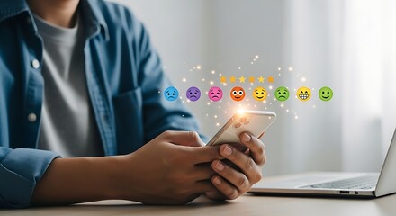 Customer experience concept with person using smartphone and rating scale