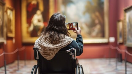 The back of a young woman using a wheelchair taking photos of artwork while visiting a museum. For relaxation and aesthetics in visiting art works.