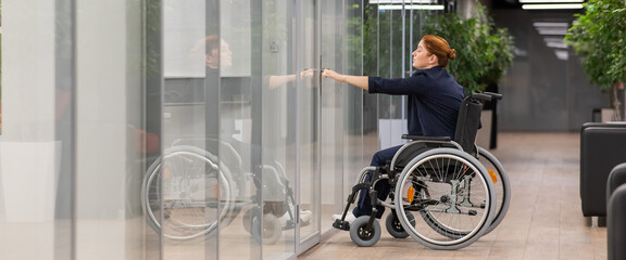 Happy disabled entrepreneur using her ID card key to unlock office door.