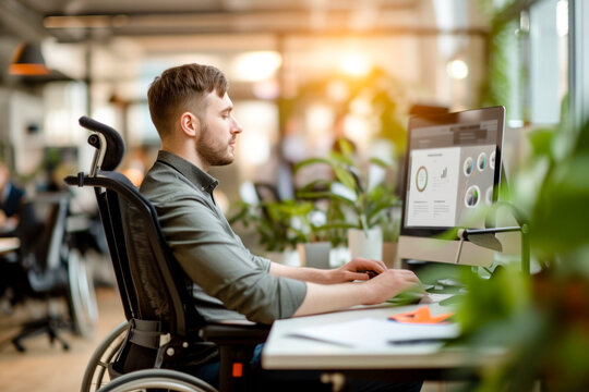 disabled staff in an office, happy young adult man in wheelchair in a office