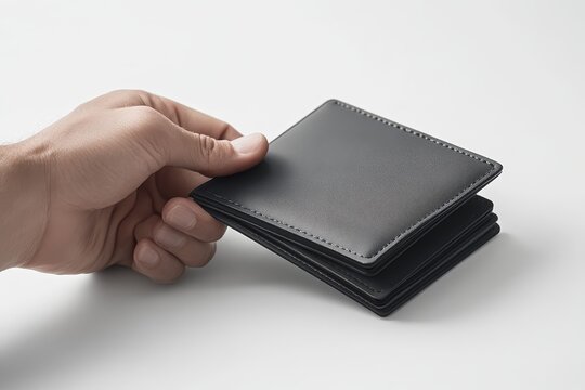 Hand holding a stack of slim, dark gray leather wallets.
