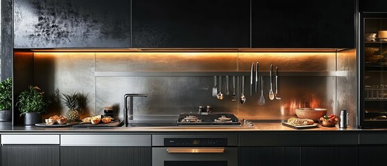 Elegant Contemporary Kitchen Design with Handleless Black Cabinets and Warm Wood Surfaces.