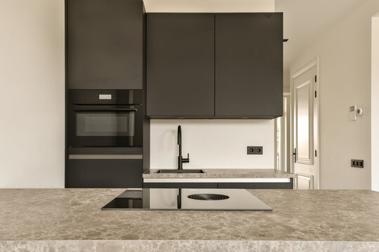 Front view of a modern designer kitchen with smooth handleless cabinets with black edges, black glass appliances, a marble island and marble countertops
