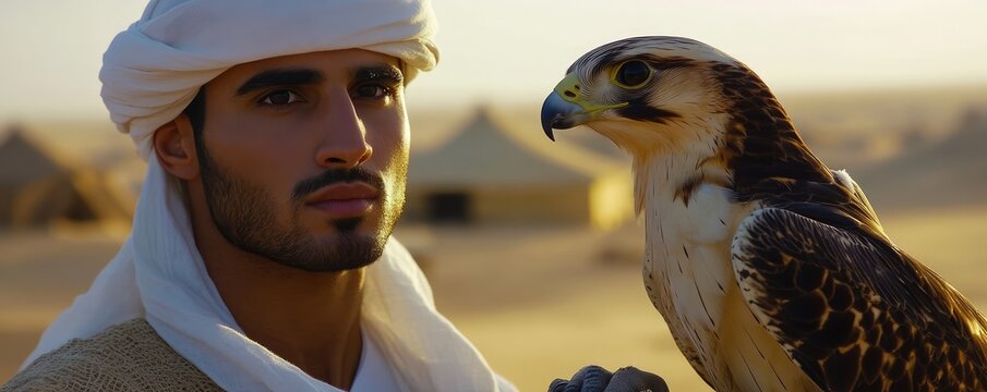 Falconer holding harris's hawk, a symbol of trust and training in falconry