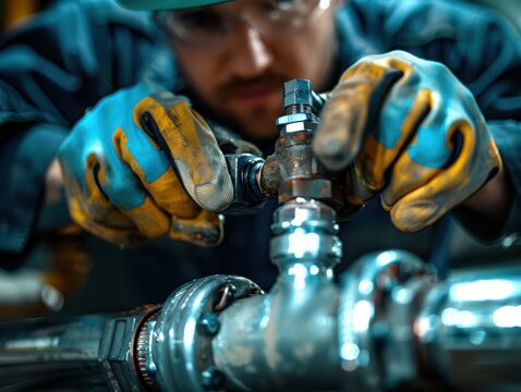 A close-up of a worker fixing a pipe with a valve. The worker is wearing gloves and focusing on the task in an industrial setting.