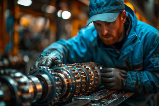 Gloved technician adjusting metal part on workbench with industrial ar readouts