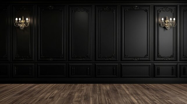 Symmetrical pattern of intricate black paneling in an elegant, empty room with gold handles on each panel.