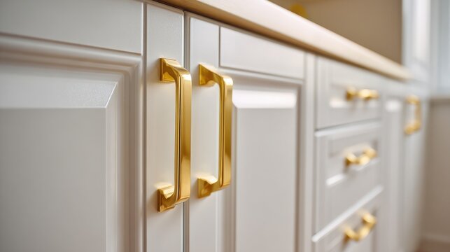 A High Resolution image of closeup of elegant gold cabinet handles on white kitchen cabinetry.