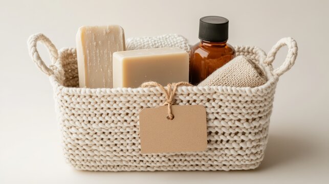Chic sustainable gift set featuring eco-friendly handmade soaps, beeswax candles, and organic skincare in a reusable woven basket with minimalist tag against a white background