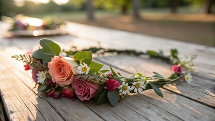 A vibrant flower crown adorned with various colorful blossoms rests elegantly on a rustic wooden table, showcasing nature's beauty and artistry.