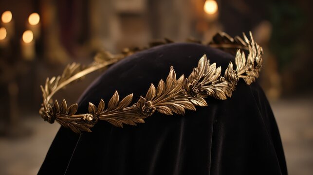 Elegant Golden Laurel Crown on Black Velvet Surface with Candlelight