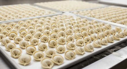 Rows of handmade dumplings on trays in a commercial kitchen setting