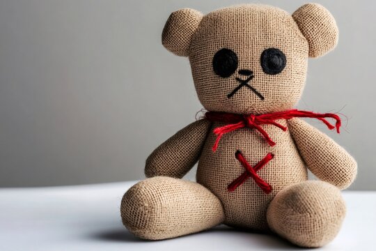 Sad rag doll bear sitting on white surface with neutral background