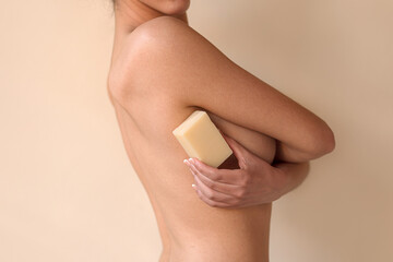 Woman hands holding natural organic solid green soap bar made with olive oil on blue background. Healthy lifestyle, beauty, skin care. Zero waste home concept.