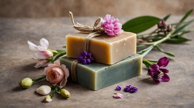 Colorful handmade soaps surrounded by fresh flowers on a rustic surface in soft lighting