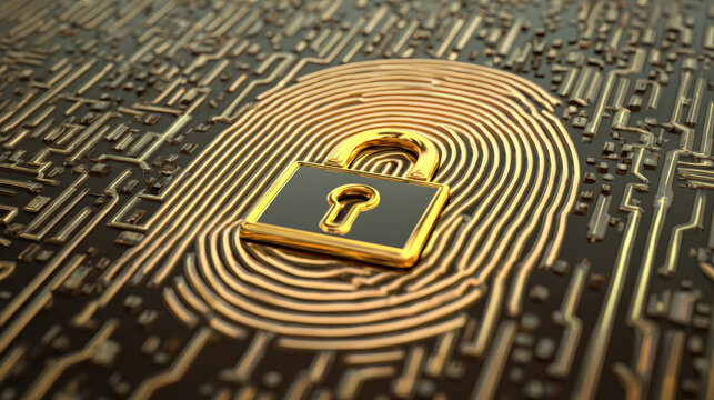 digital fingerprint merging with padlock icon over circuit board identity safeguarding visual illustration concept scene visual for commercial design use high detail quality stock image illustration