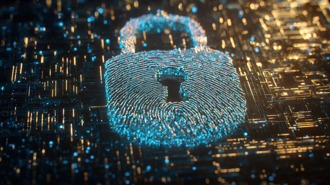digital fingerprint merging with padlock icon over circuit board identity safeguarding visual illustration concept scene visual for commercial design use high detail quality stock image illustration