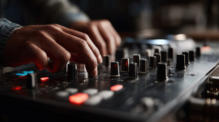 Close-up of hands adjusting knobs and pressing colorful illuminated buttons on a retro electronic control panel in a dimly lit environment.