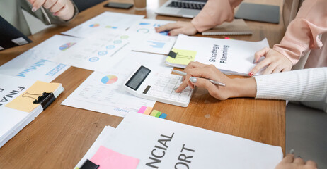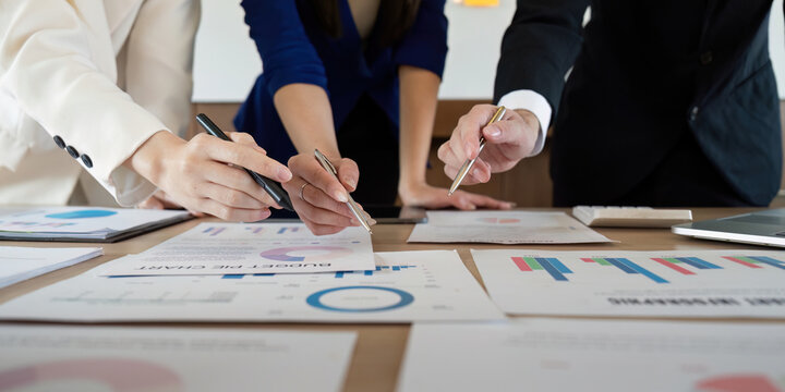 A focused view of business professionals analyzing financial charts and graphs on a desk signifying data driven decision making and collaborative strategy in a corporate environment
