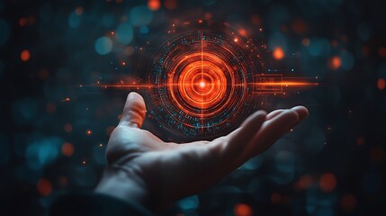 Wireframe hand holding flaming arrows surrounded by confetti in a digital space