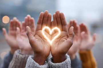 Diverse hands embrace a glowing heart, radiating warmth, generosity, and united hope.