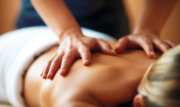 Close-up of a woman's back receiving a deep tissue massage, with hands applying pressure to the skin in a relaxing spa setting