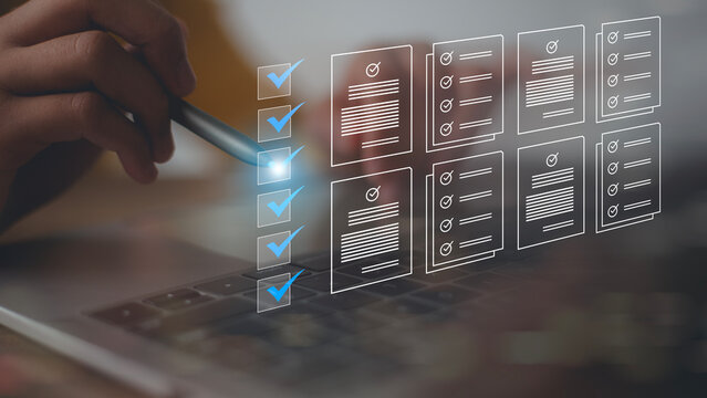 A person is using a laptop with a stylus to check off items on a list. The list appears to be a to-do list or a checklist, and the person is actively engaging with it
