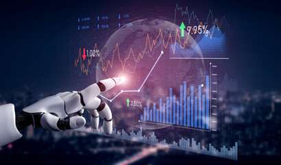 A robotic hand engages with a dynamic digital interface showcasing graphs, charts, and a world map, illustrating advanced analytics and modern technology themes. Impute