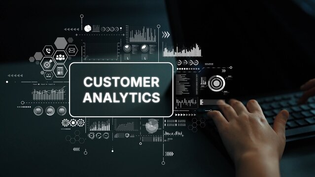 Hands Engaged in Customer Analytics with Visual Data Charts and Graphs in Modern Digital Environment. Asymptotic smart data analytic.