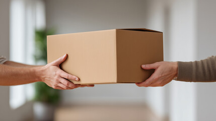 Hands exchanging a cardboard box, symbolizing moving, packing, and delivery services for relocation and new beginnings.