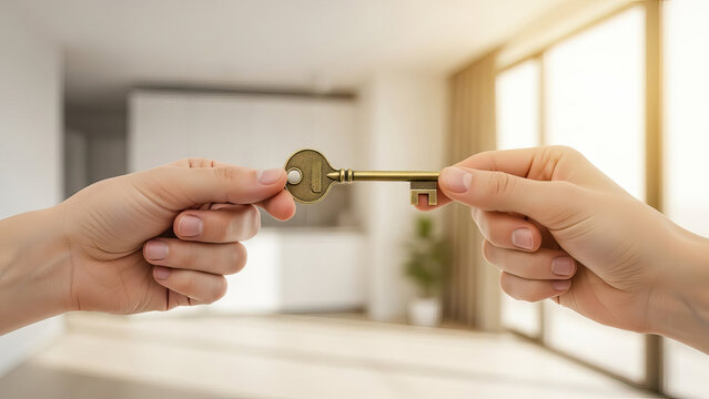 Close-up of hands exchanging house keys indoors, property transfer and real estate agreement concept in modern home environment.