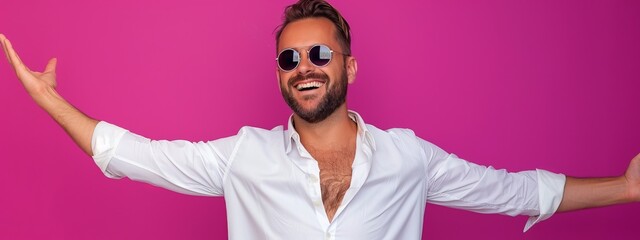 A man in a white shirt and sunglasses, with his arms extended and hands positioned in front of his face