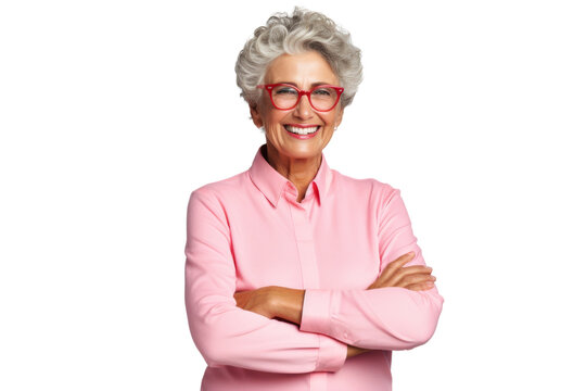 Photo portrait of pretty senior female look empty space crossed hands wear trendy yellow outfit isolated on violet color background