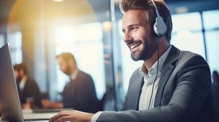 Man wearing wireless headset and glasses having online video call meeting in home interior.