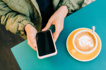Hands holding smartphone and coffee in cozy cafe environment