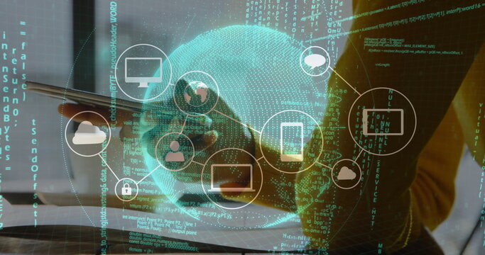 Holding tablet and stylus, professional interacting with digital globe and network icons at office
