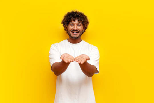 Young woman over yellow wall holding copyspace imaginary on the palm to insert an ad