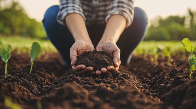 39. Female farmer hands holding and inspecting dark, fertile soil in a field, with a focus on sustainable agriculture and ecological practices