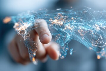 hand interacting with digital map, highlighting global connections and trade routes. visualization showcases high tech representation of international commerce