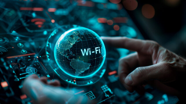 high tech image featuring hand interacting with digital globe displaying Wi Fi connectivity, symbolizing global communication and technology