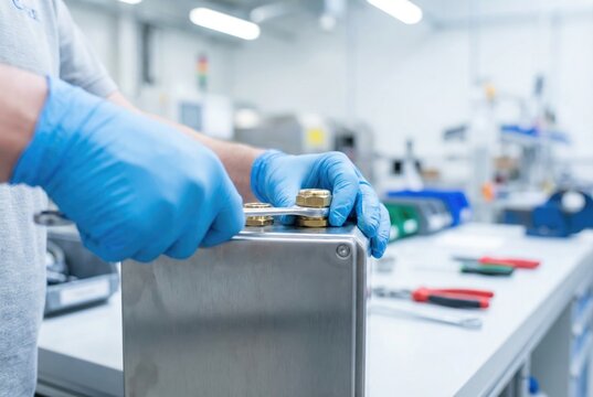 Worker repairs equipment at a manufacturing facility using a wrench for precise adjustments during a busy workday in the afternoon