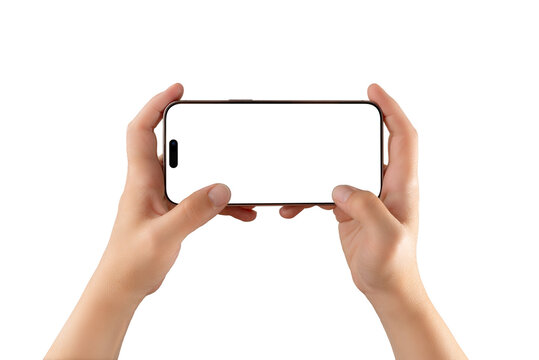 Horizontal phone mockup in hands on white transparent background, ideal for app demonstrations, fullscreen content, or responsive layout designs