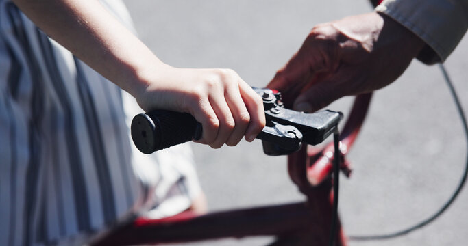 Closeup, child and teaching bicycle ride for safety, parent and neighbourhood with hands. Cycling, childhood memory and riding in summer, bonding together and handlebar with bike bell for alert