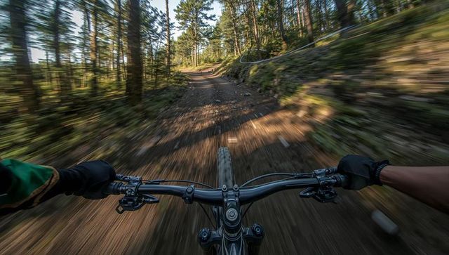 Cyclist riding through sunlit park path, hands gripping handlebars at golden hour